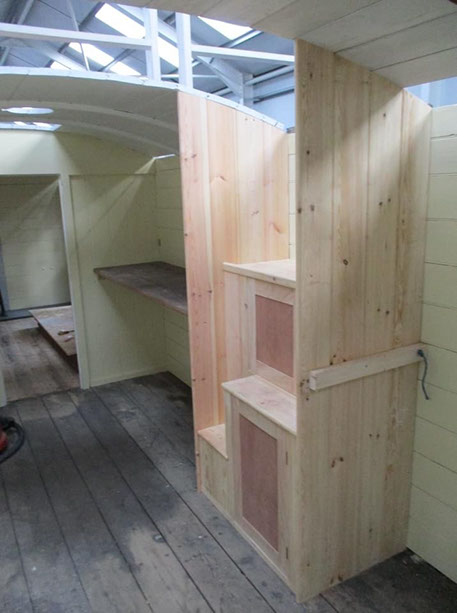This work is well in hand and the first section to be completed is the guard's high level seat. Stalwart Alan Headech, one of the dynamos behind the restoration, prepared working drawings from our copies of the surviving general arrangement drawings. Alan has completed the carpentry and joinery with the exceptionally fine results seen in these photos which illustrate the steps and seat at the top. The structure has added considerable rigidity to the whole van.
